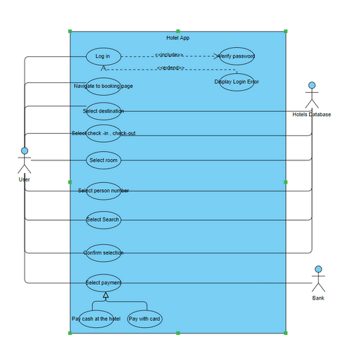In the above use – case diagram I described how the user will perform tasks on the app. There are 3 actors, the “User” actor which is the primary actor and the secondary actors “Hotels Database” and “Bank”. The name of the system is “Hotel App”, after the user logs in, his password will be verified if all is alright he can proceed to the booking page if not he will get a login error message. After navigating to the booking page first he needs to select the destination, checkin/check-out, room, person number and search for the hotel with the corresponding room and when he is satisfied he can confirm the selection. All this use cases are associated with the user actor and the hotel database actor to get/set/update/delete the corresponding data. After all this is done the user must pay with card or cash at the hotel this also has an association with the bank actor that is responsible for the payment.